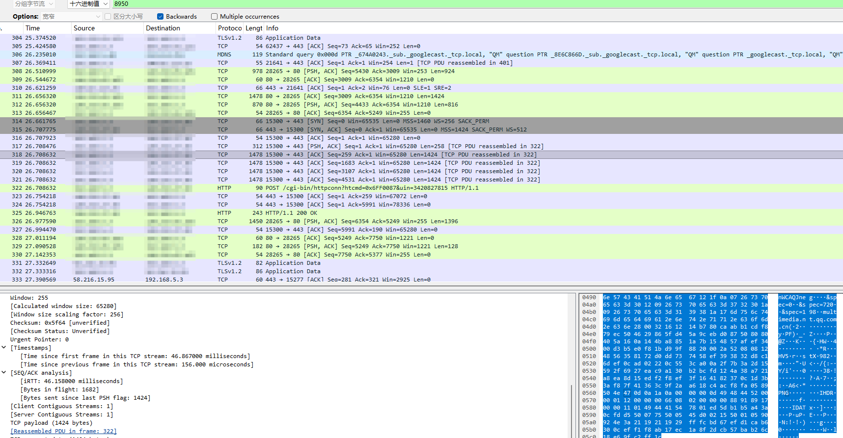 由于发送的是png图片文件,而 png 格式图片具有固定的文件头标识(十六进制 89 50 4e 47 ), 因此可通过 Wireshark 的二进制数据搜索功能,精准定位该图片的传输数据包。